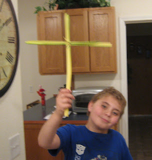 After the Park we rode bikes to church. 1st we went to confession. Then we attended the blessing of the palms celebration before mass. After we blessed the palms everyone followed the Father and the choir around the outside of the church to do a parade while holding our newly blessed palms. After the parade we attended mass. When mass was over we rode our bikes home in the rain because it rains here everyday (mom is the only one who loves it!). At home Mom taught Brayden how to make a cross out of his Palms. He did a great job! |