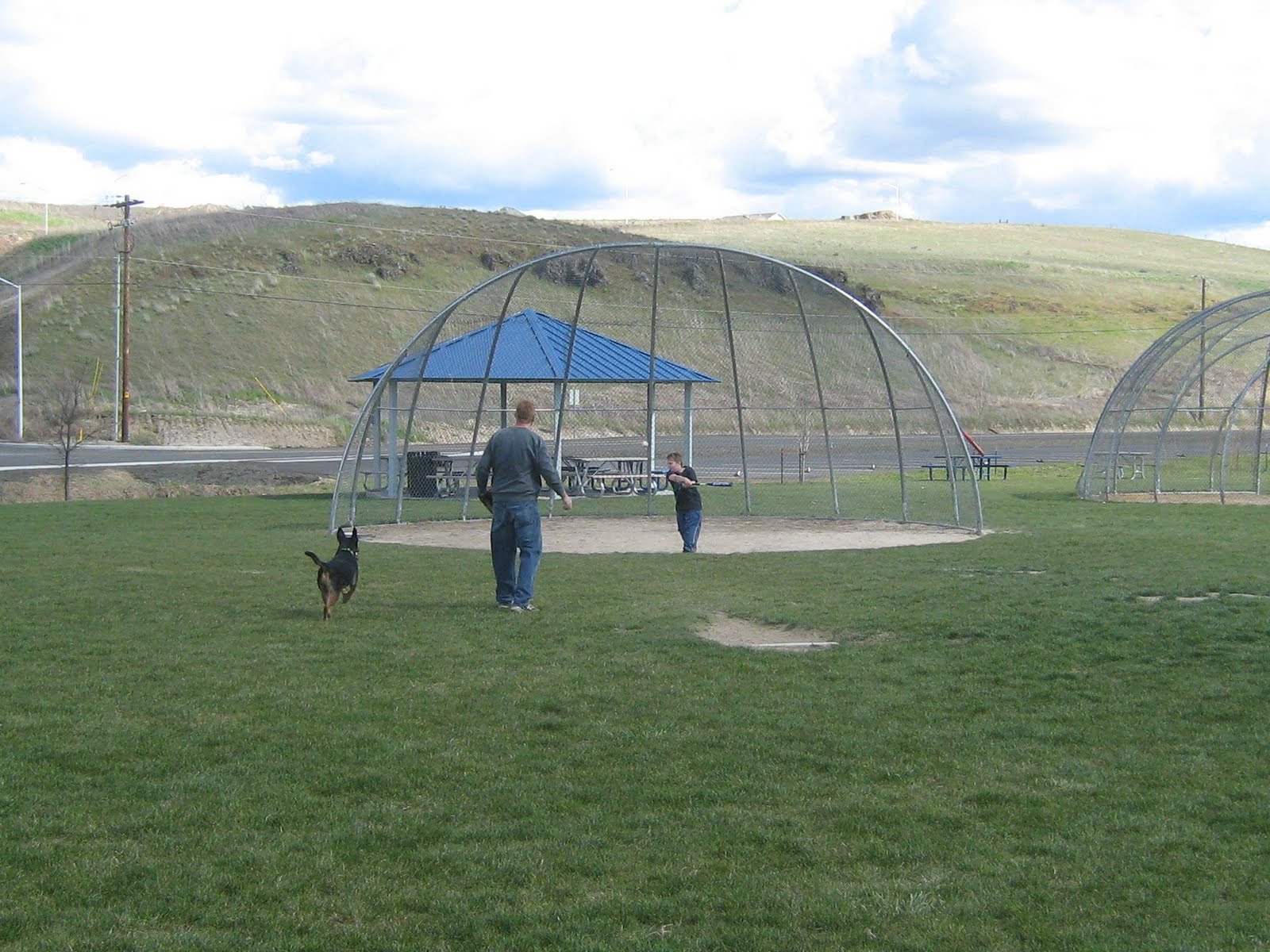 | After everybody left we stayed at the park and played a little more, Dad pitched, Brayden hit, and Mom and Rocky chased the balls! |