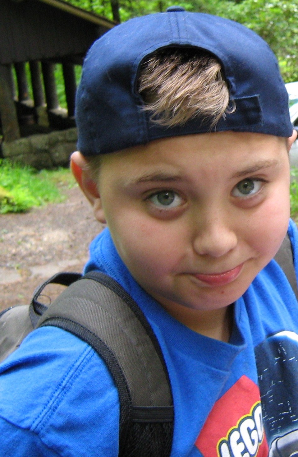 | Brayden enjoying the rain waterfalls coming off the mountain |