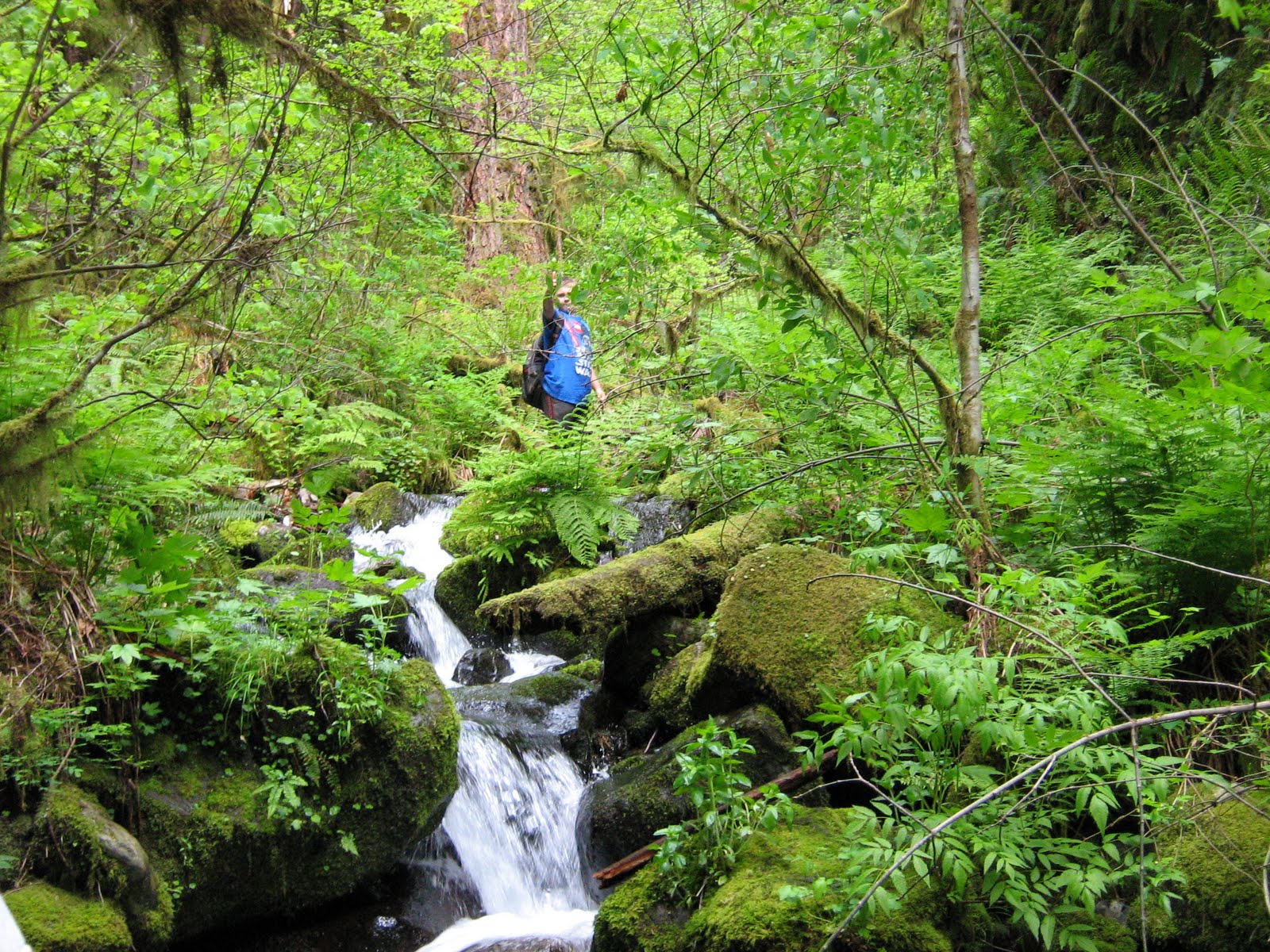 Brayden enjoying the rain waterfalls coming off the mountain |